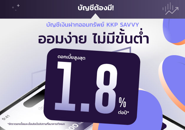 รับดอกเบี้ยเพิ่มสูงสุด 1.8% ต่อปี เมื่อเปิดบัญชี KKP SAVVY เพื่อเป็นบัญชีรับดอกเบี้ยของ KKP e-FIXED