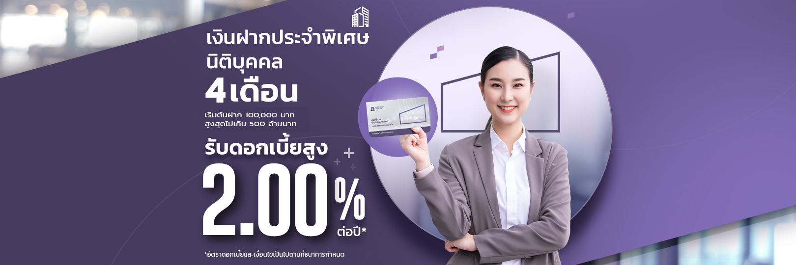 • เฉพาะลูกค้าประเภทลูกค้านิติบุคคลทั่วไป ,ลูกค้านิติบุคคลที่ไม่แสวงหากำไร และนิติบุคคลพิเศษ* (*ยกเว้นบริษัทประกัน กองทุน บริษัทบริหารสินทรัพย์ หรือบริษัทที่มีลักษณะเป็นสถาบันการเงิน ไม่สามารถเปิดรับฝากผลิตภัณฑ์นี้ได้)?