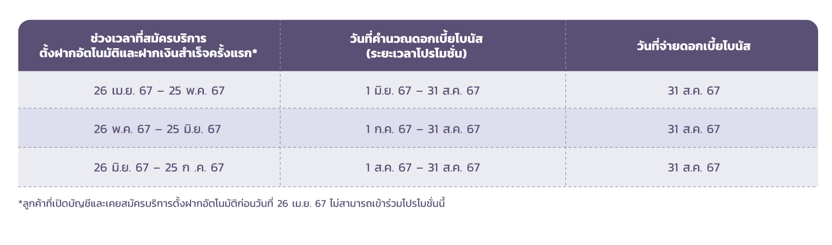 ระยะเวลาโครงการโปรโมชั่นตั้งแต่วันที่ 26 เม.ย. 67 - 25 ก.ค. 67 ทั้งนี้ตามเงื่อนไขที่ธนาคารกำหนดหรือจนกว่ายอดสมัครบริการตั้งฝากอัตโนมัติและฝากเงินสำเร็จครบ 100,000 สิทธิ์