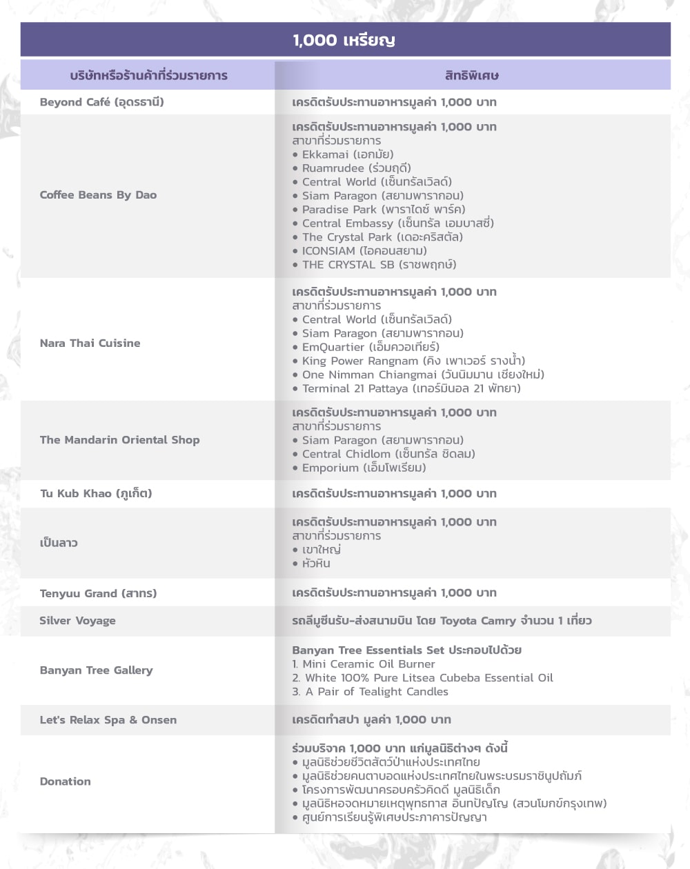 รับสิทธิ์รับประทานอาหาร มูลค่า 1,000 บาท จำนวน 1 ครั้ง/ปี